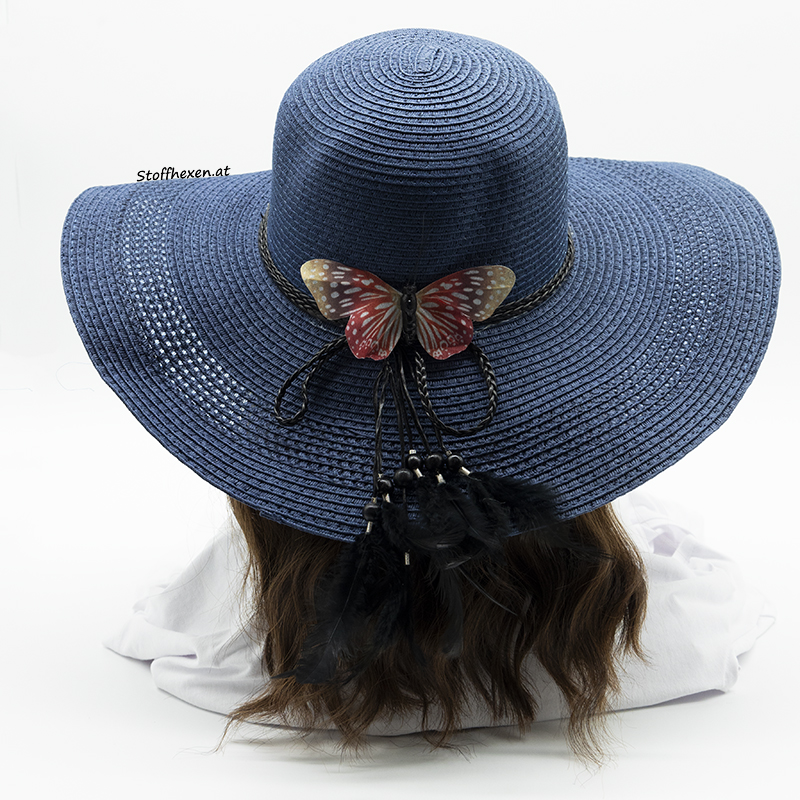 Eleganter Strohhut in Blau mit Schmetterling und Band für den perfekten Sonnenschutz im Gesicht mit breiter Hutkrempe.