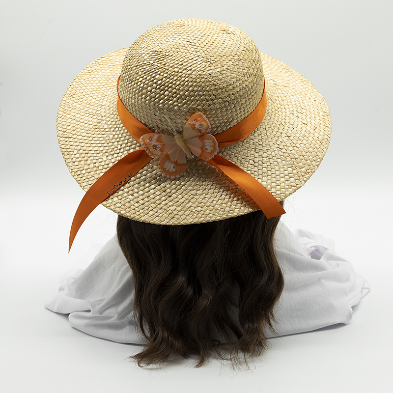 Eleganter Strohhut mit Schmetterling und orangem Band für den perfekten Sonnenschutz im Gesicht mit breiter Hutkrempe.