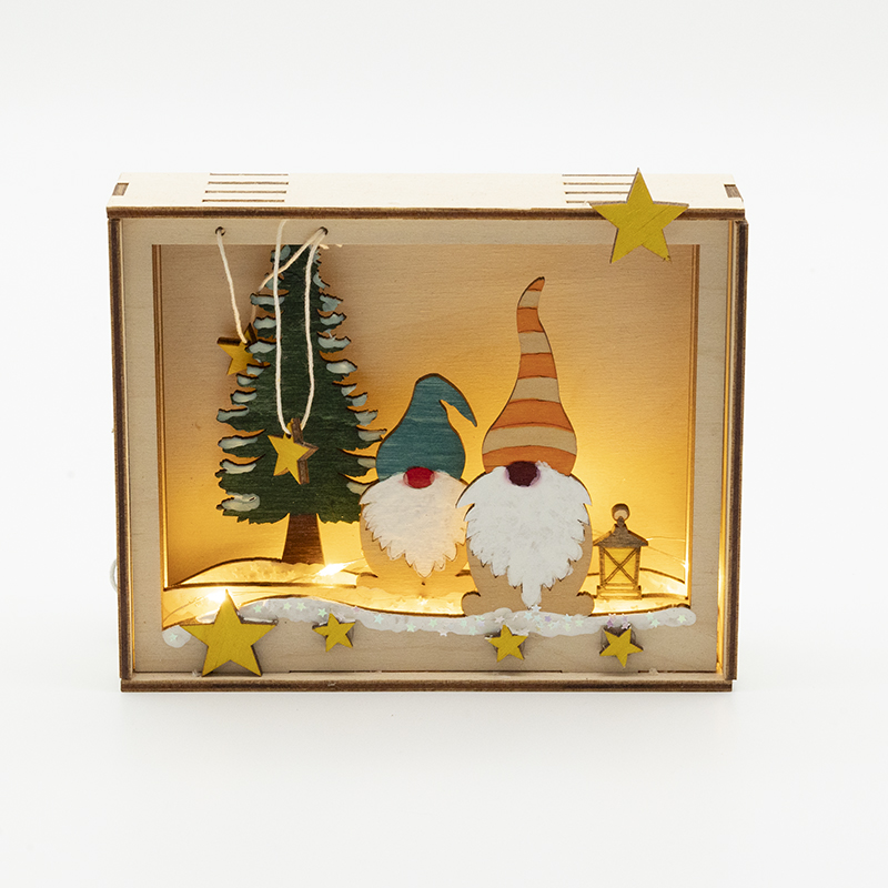 Rahmen mit Weinachtwichtel liebevoll gestaltet mit Beleuchtung.